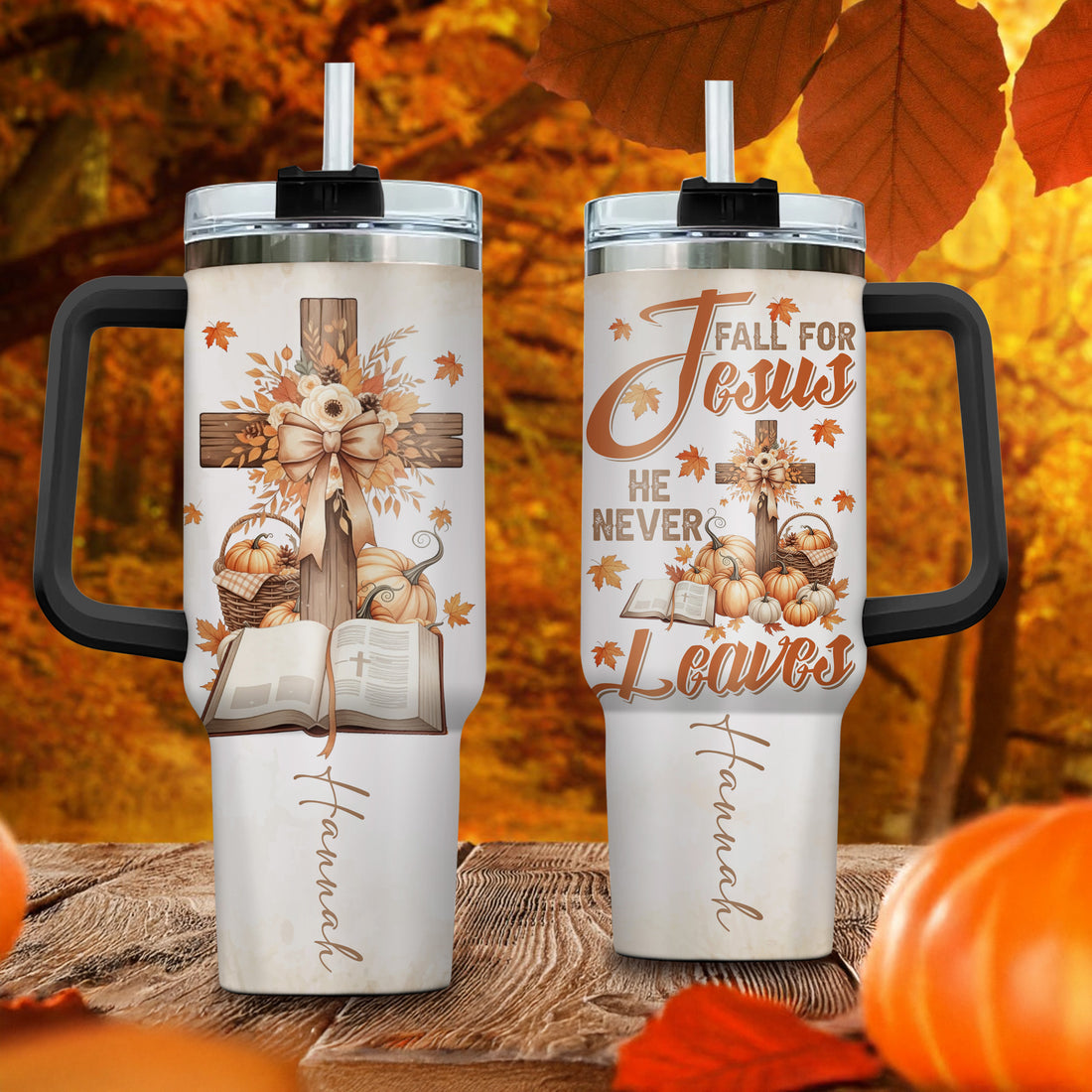 Personalized Christian Fall Tumbler 40oz | Fall for Jesus He Never Leaves Cup | Custom Name Faith Mug with Handle